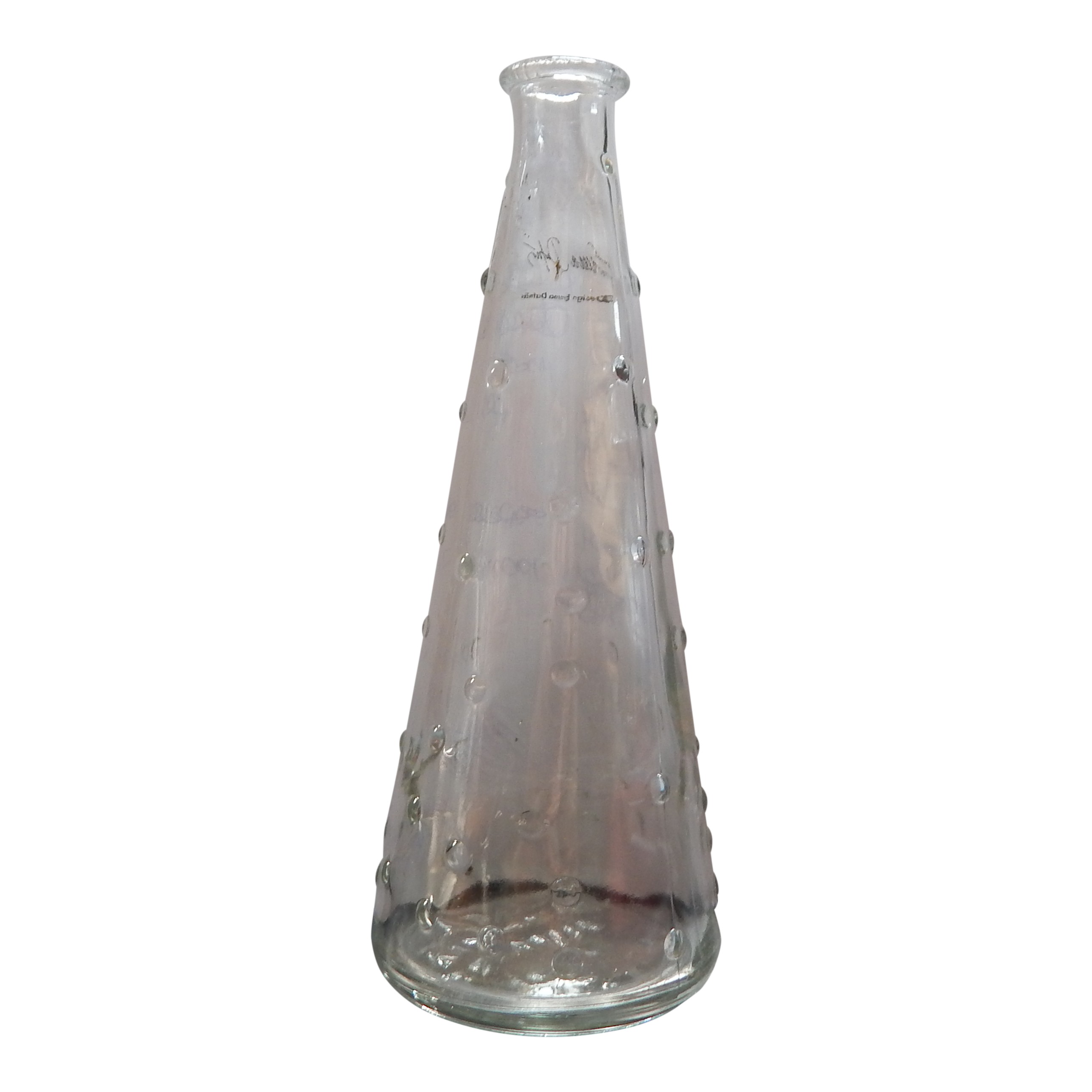 Taps toelopend bloemenvaasje van glas met decoratieve bellen als motief.