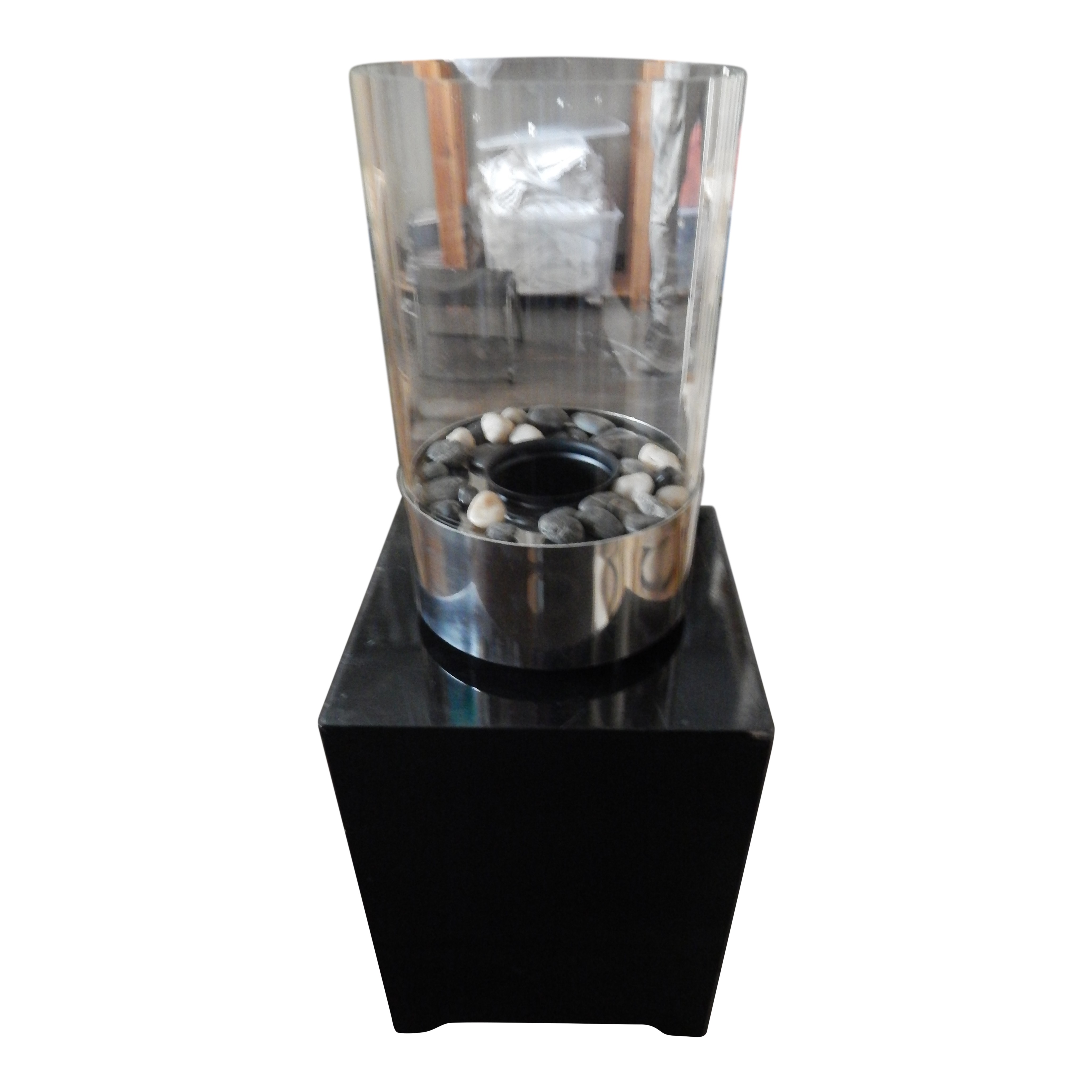 Leuke haard voorzien van rond glazen behuizing boven op een zwart houten blok.