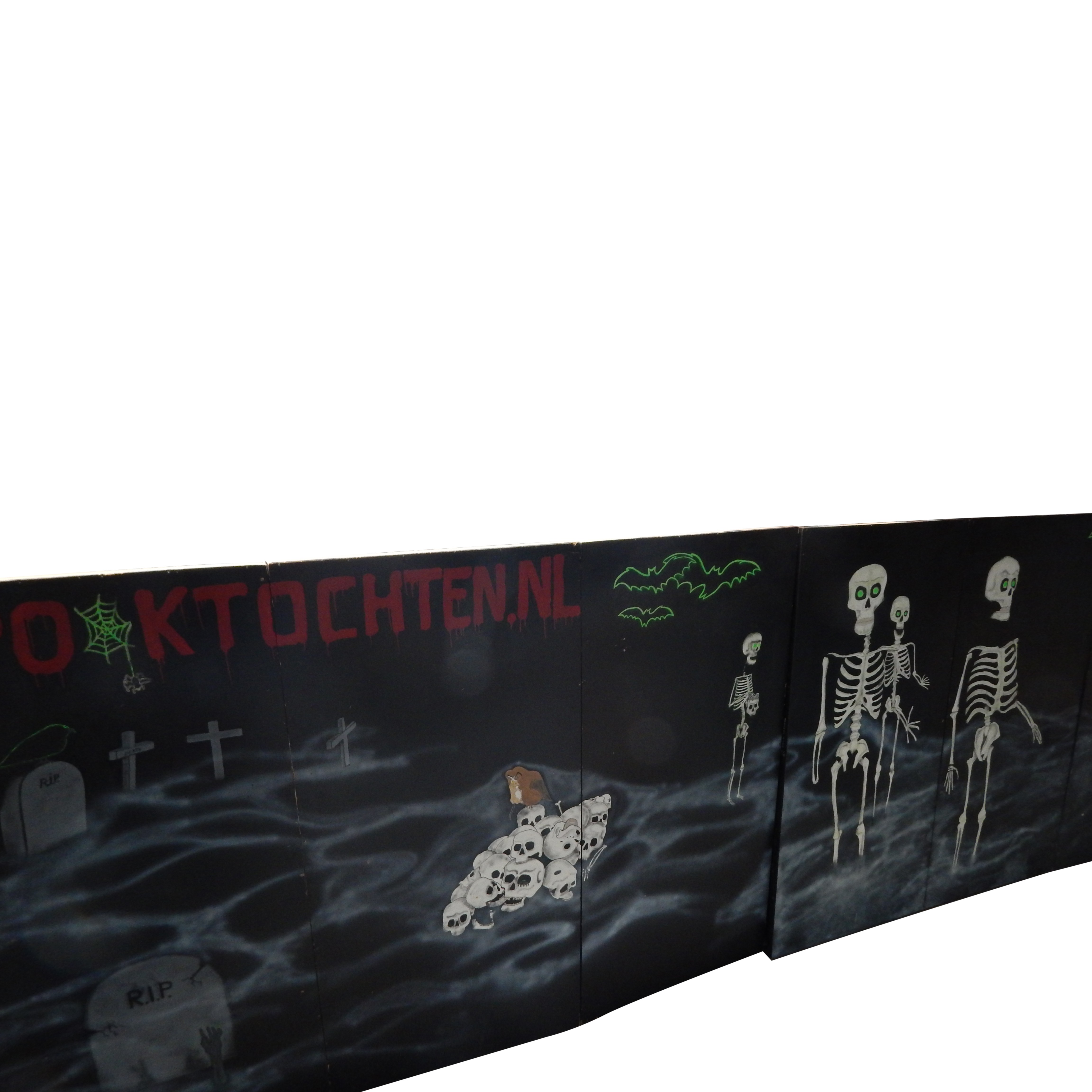 Grote wand bestaande uit 6 delen met afbeelding van skeletten en een kerkhof.