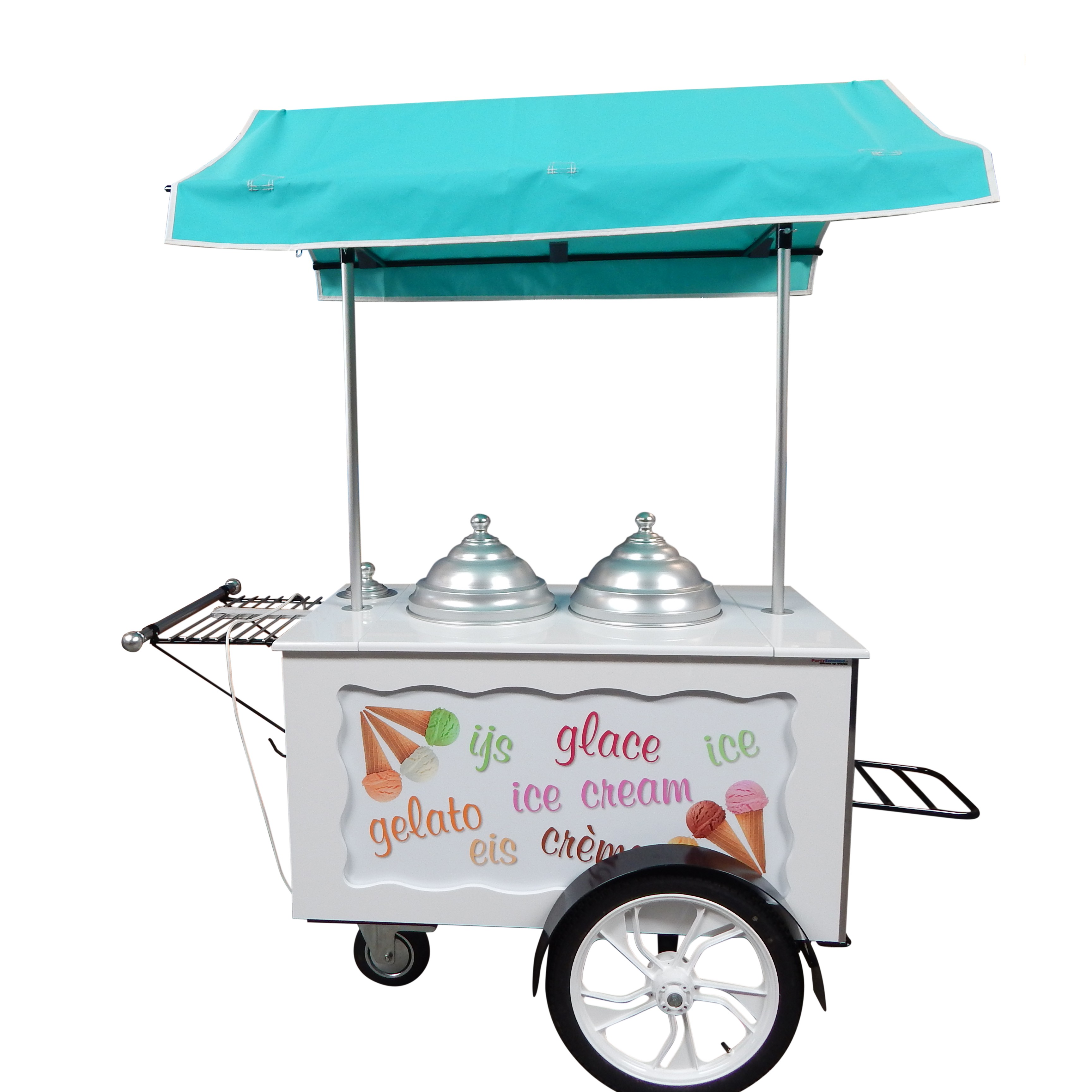 Onze IJskar is voorzien van een grote vriezer waardoor uw meerder bakken ijs kwijt kunt. Door de decoratie en de luifel valt hij overal op.