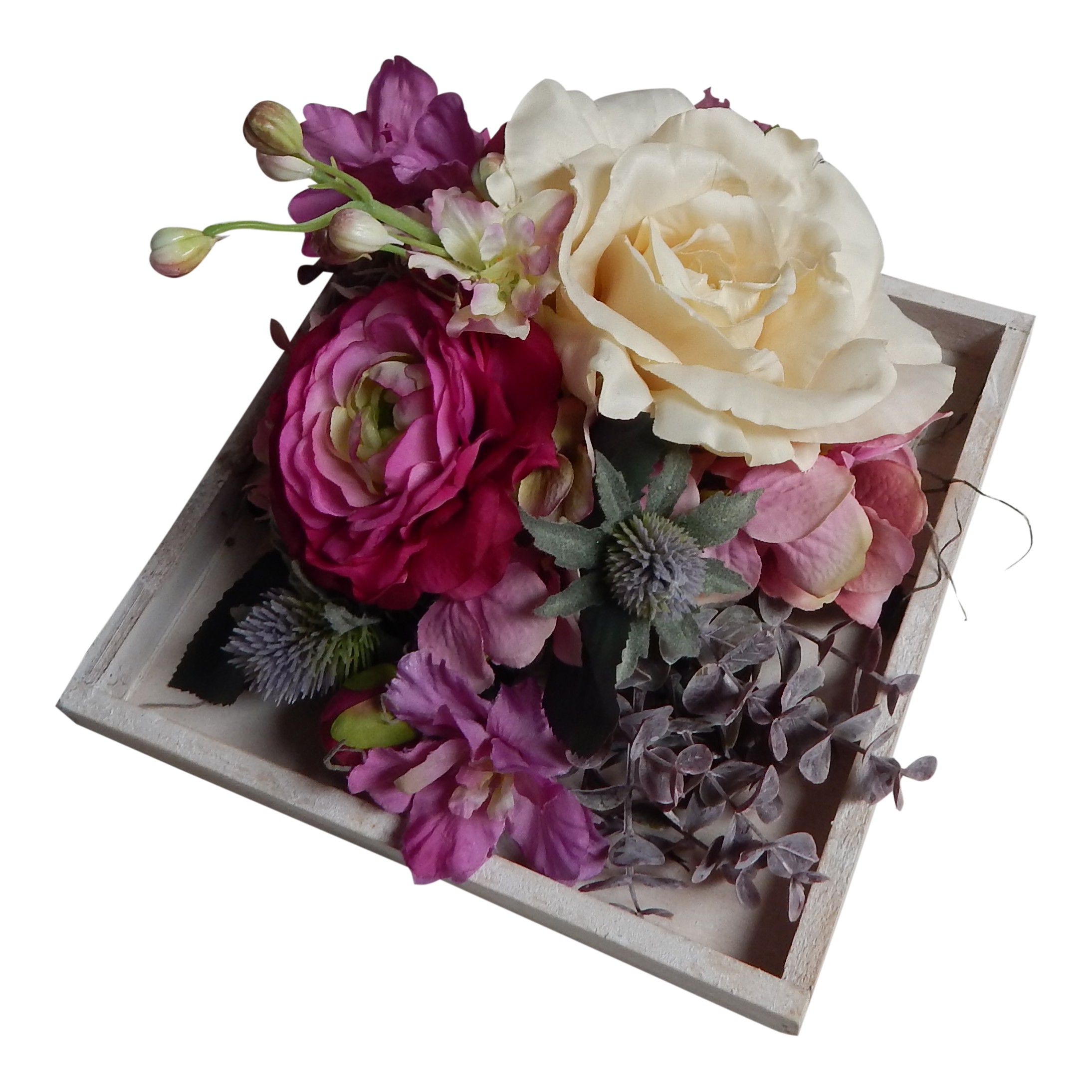 Leuk zijden tafelstukje in landelijke stijl. In dit tafelstukje zijn onder andere rozen, hortensia en diverse groenmaterialen verwerkt. Lengte: 22cm Breedte: 22cm.