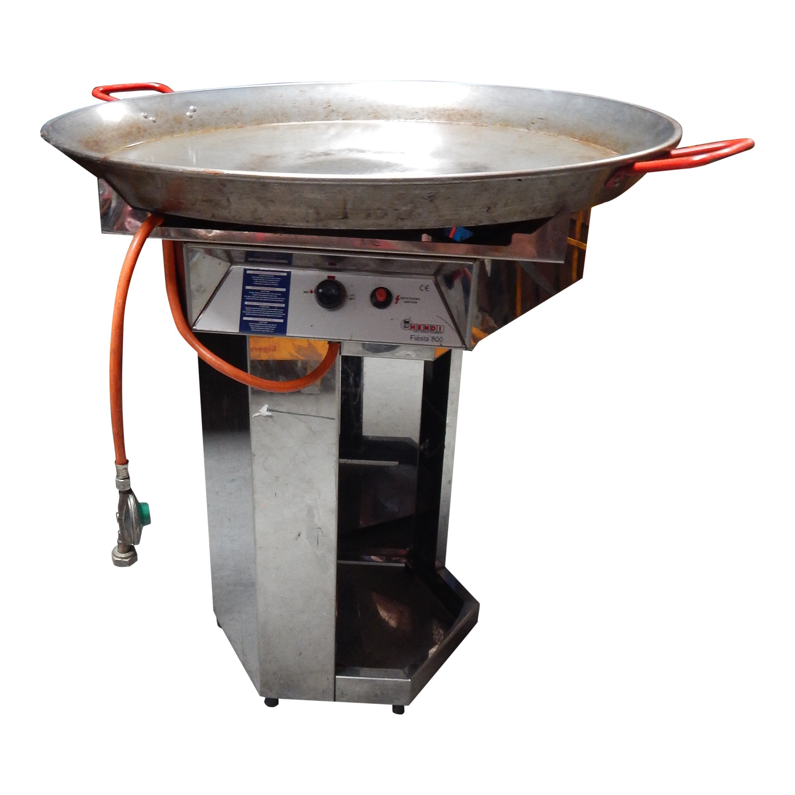 Paellapan op gas , roest vast stalen frame. bestaande uit 2 delen en losse pan van 80 cm doorsnee, super voor grote gezelschappen. Werkt op flessengas en de capaciteit is 4,3KW. Afmeting : 80x80x(h)90cm. Gas word er niet standaard bij geleverd maar kunt u er wel apart bij bestellen.