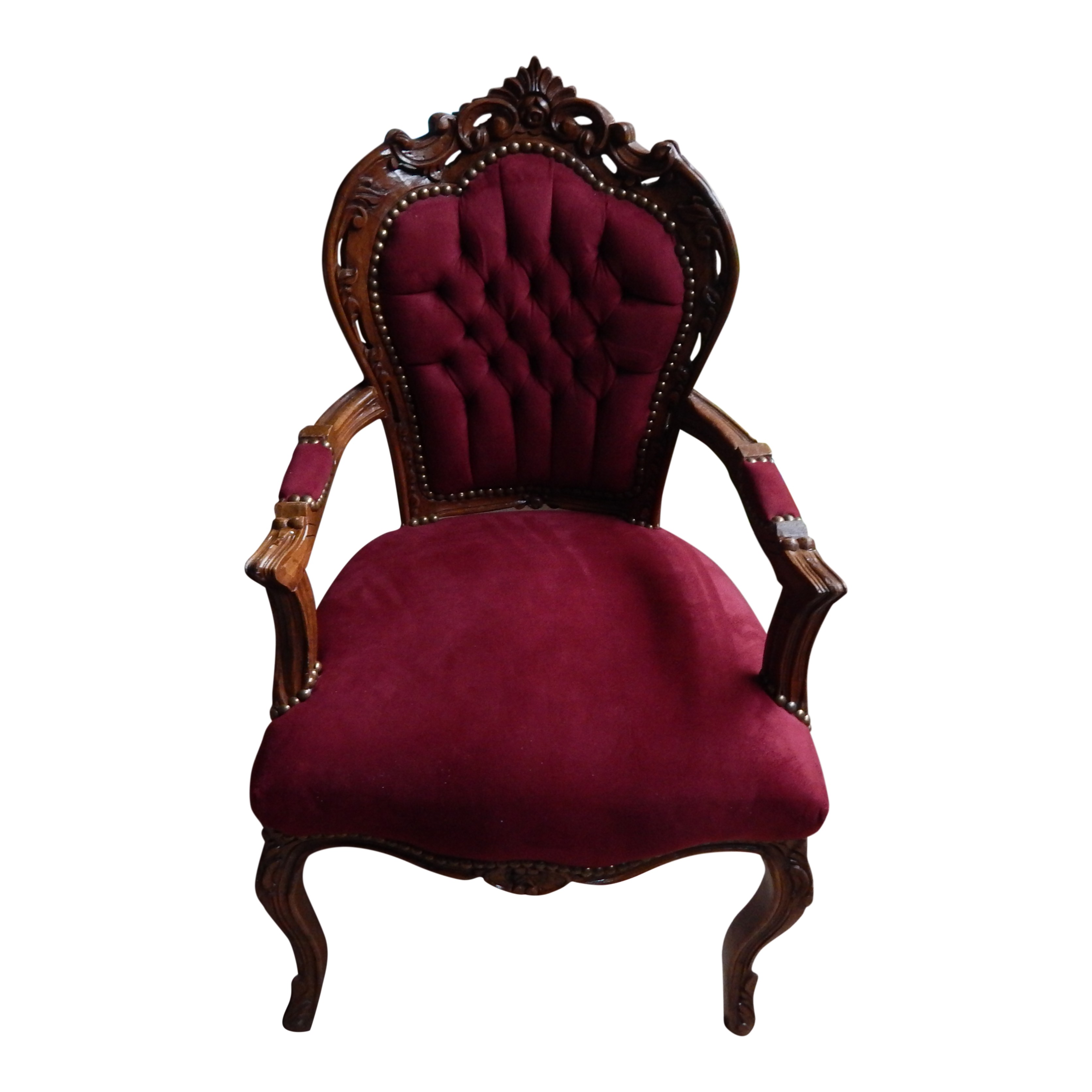 Mooi fluweel gevormde fauteuil met werkje in hout.
