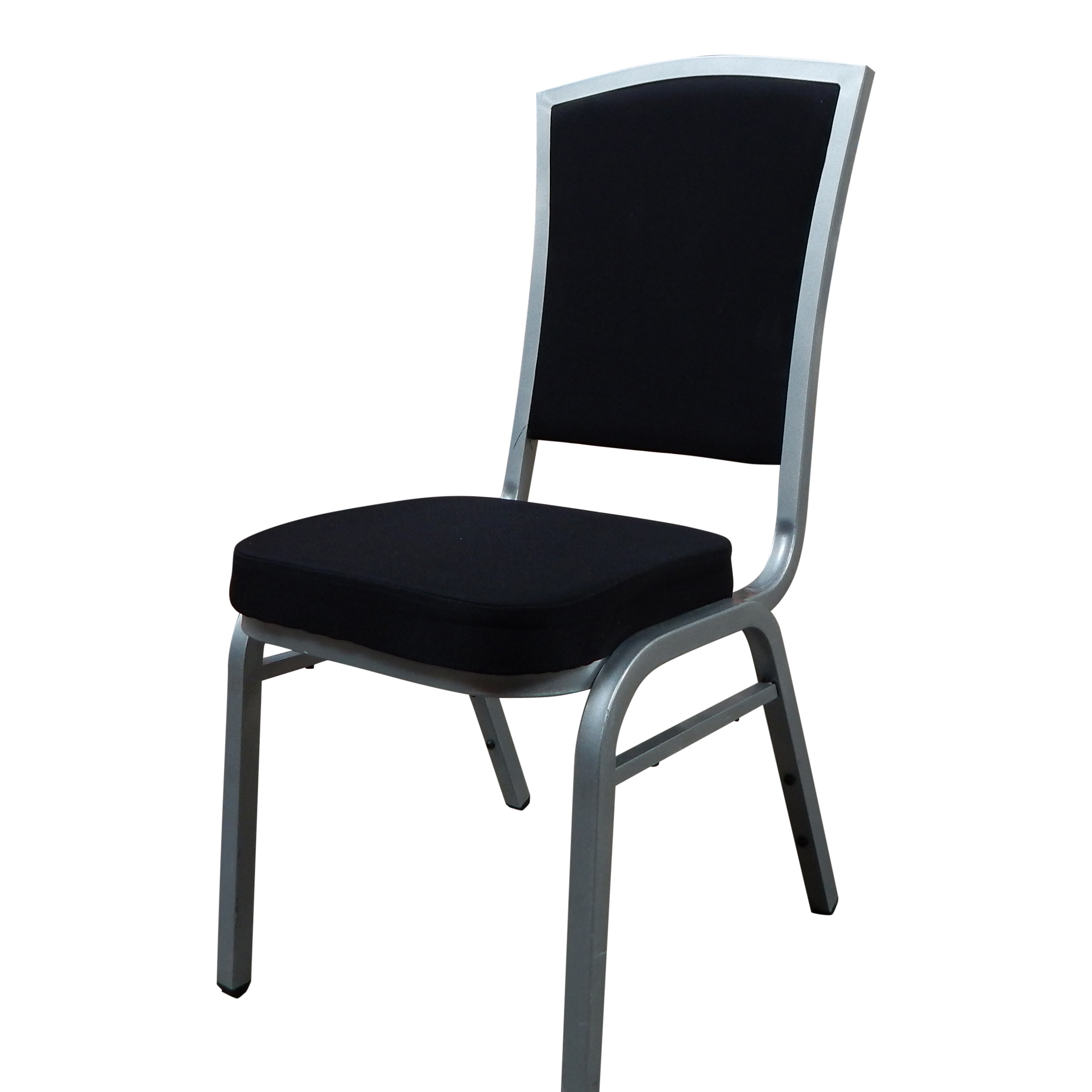 Licht metalen stapelbare stoel met zilverkleurig frame, zitkussen er rugleuning van zwarte stof.